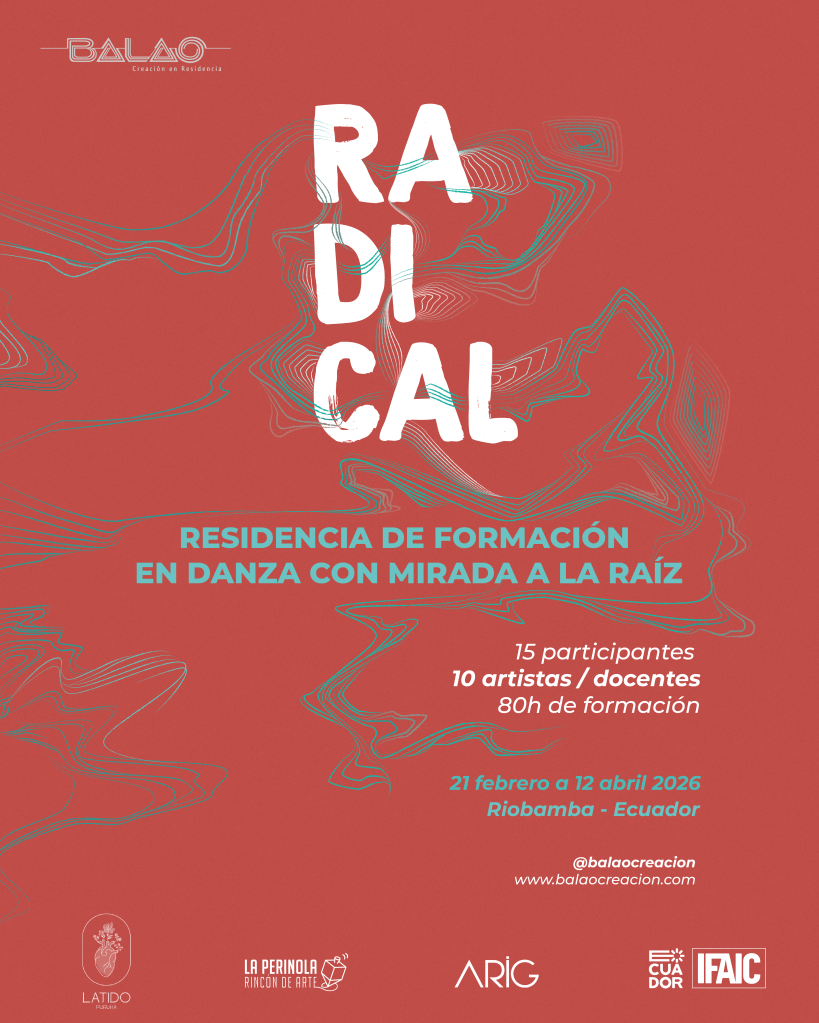 El Centro de creación en residencia Balao presenta RADICAL, un programa de formación en danza que se desarrollará en la ciudad de Riobamba, provincia de Chimborazo, proyecto ganador del Fondo de Fomento del IFAIC que además cuenta con el apoyo de la Fundación Arig.