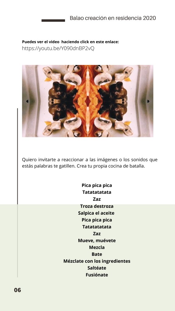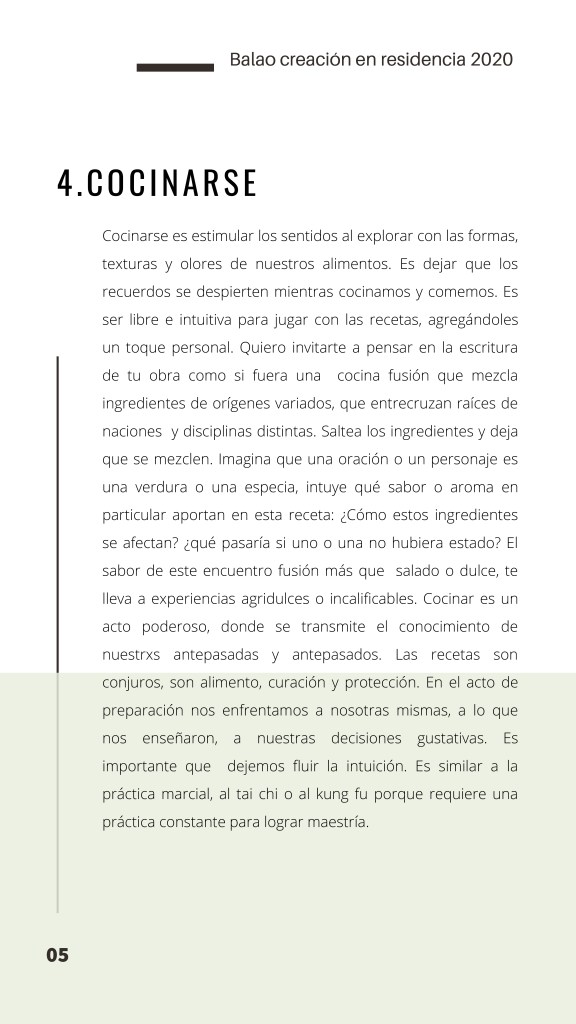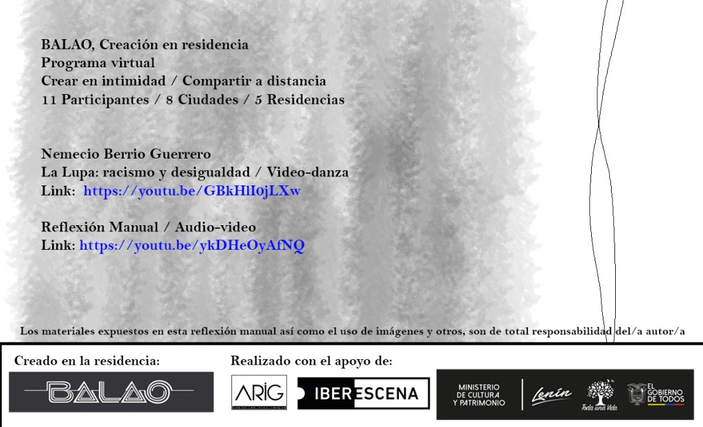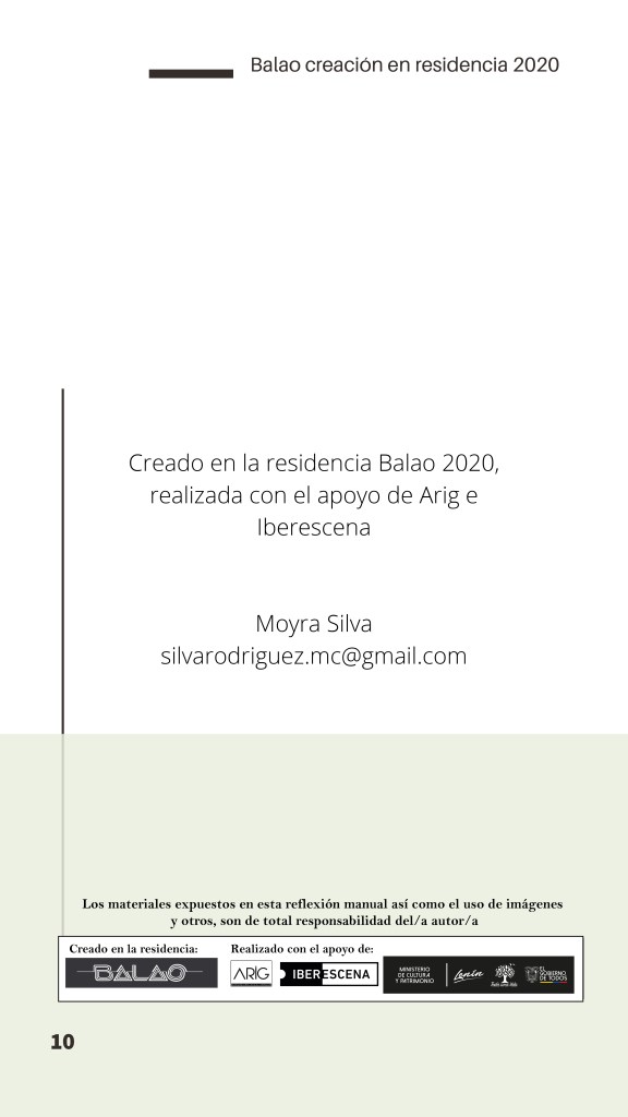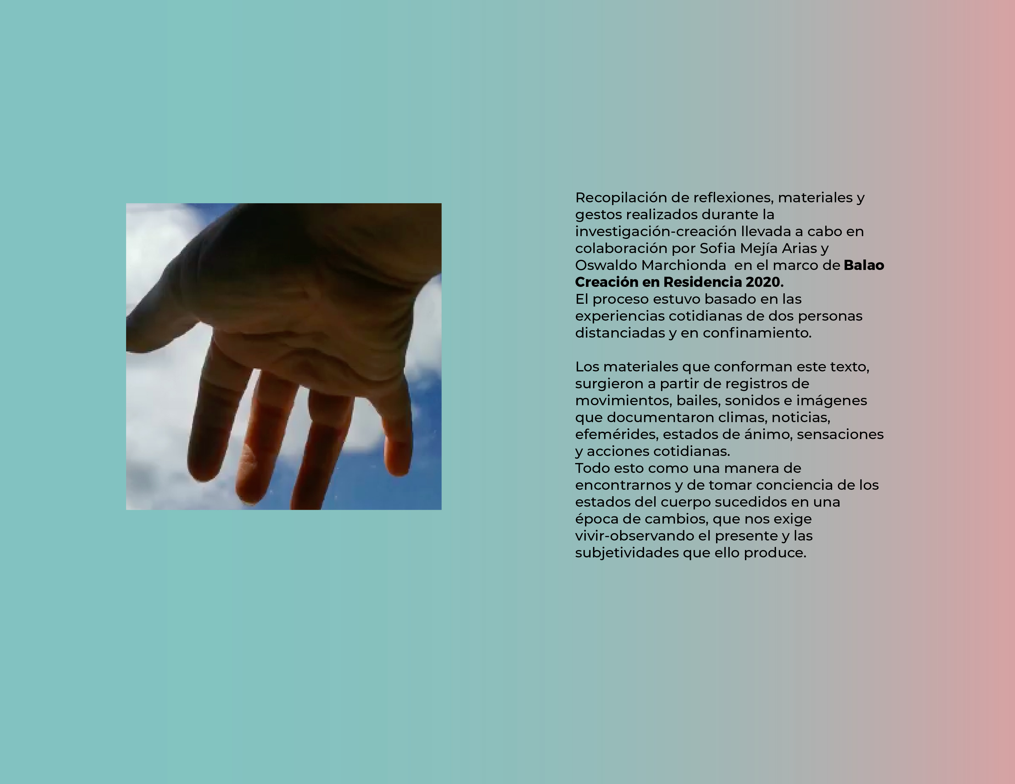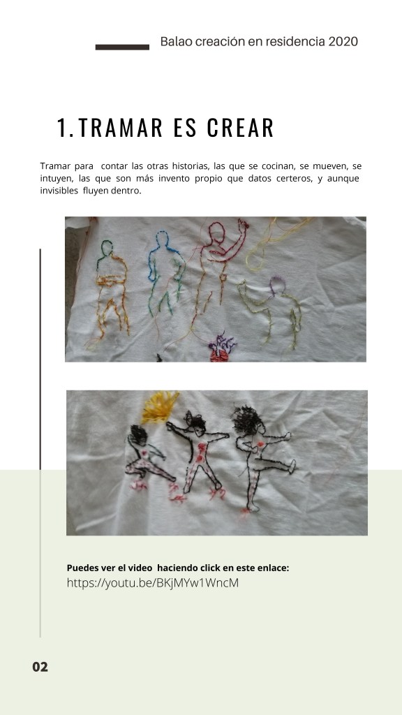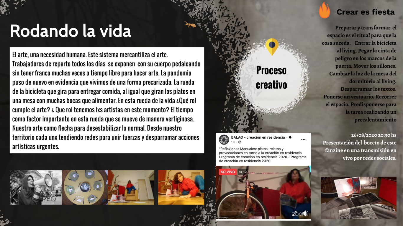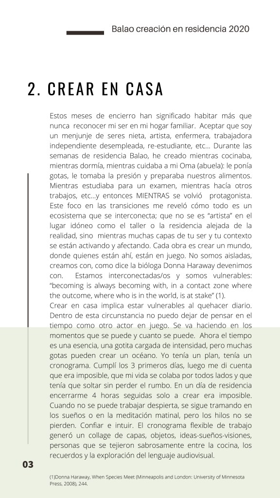 El Programa de creación en residencia Balao 2020 consistió en la realización de 5 residencias de creación con la participación de 7 artistas en 6 ciudades distintas durante alrededor de 21 días. Como parte de los procesos de creación/investigación propusimos a las artistas elaborar una reflexión manual, como un compendio de pistas, relatos y provocaciones acerca de la creación en casa.