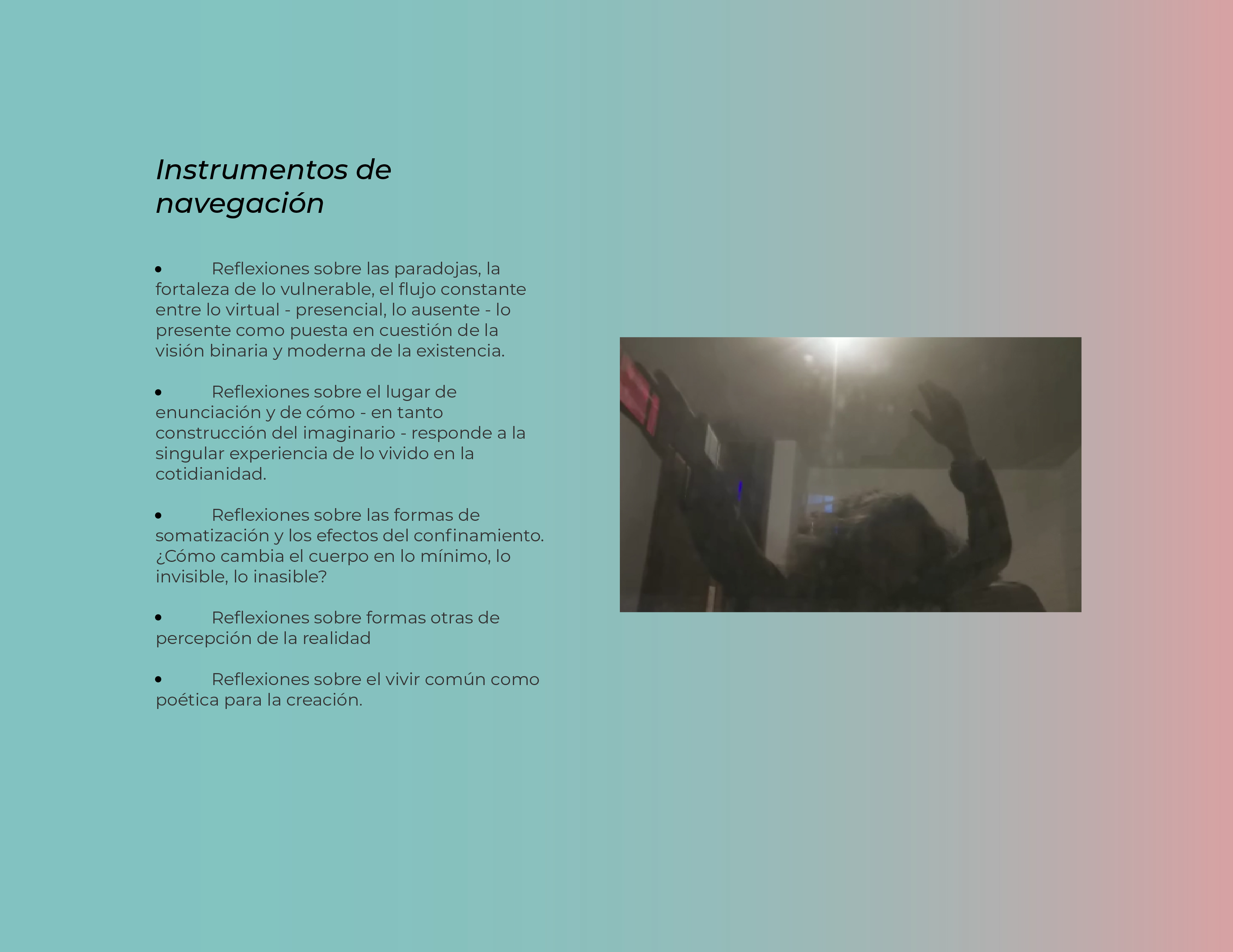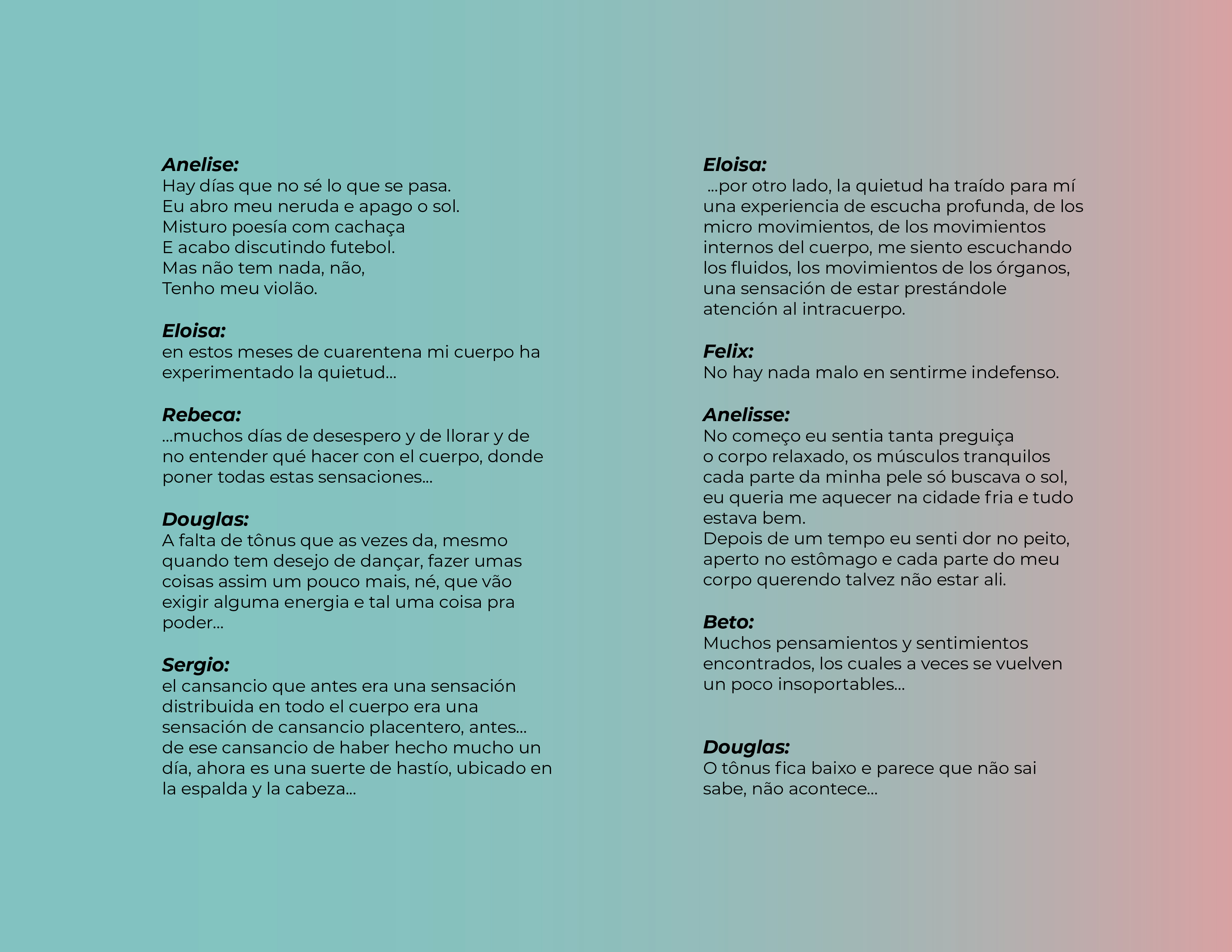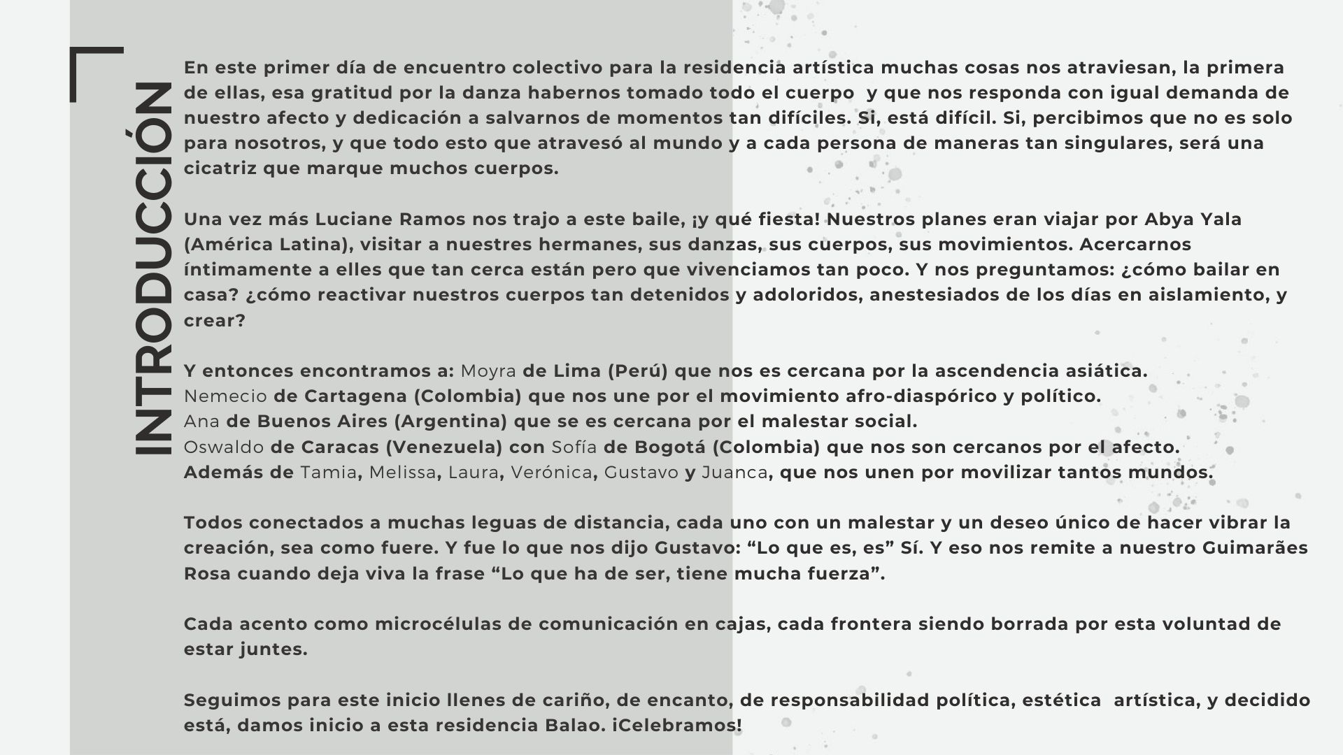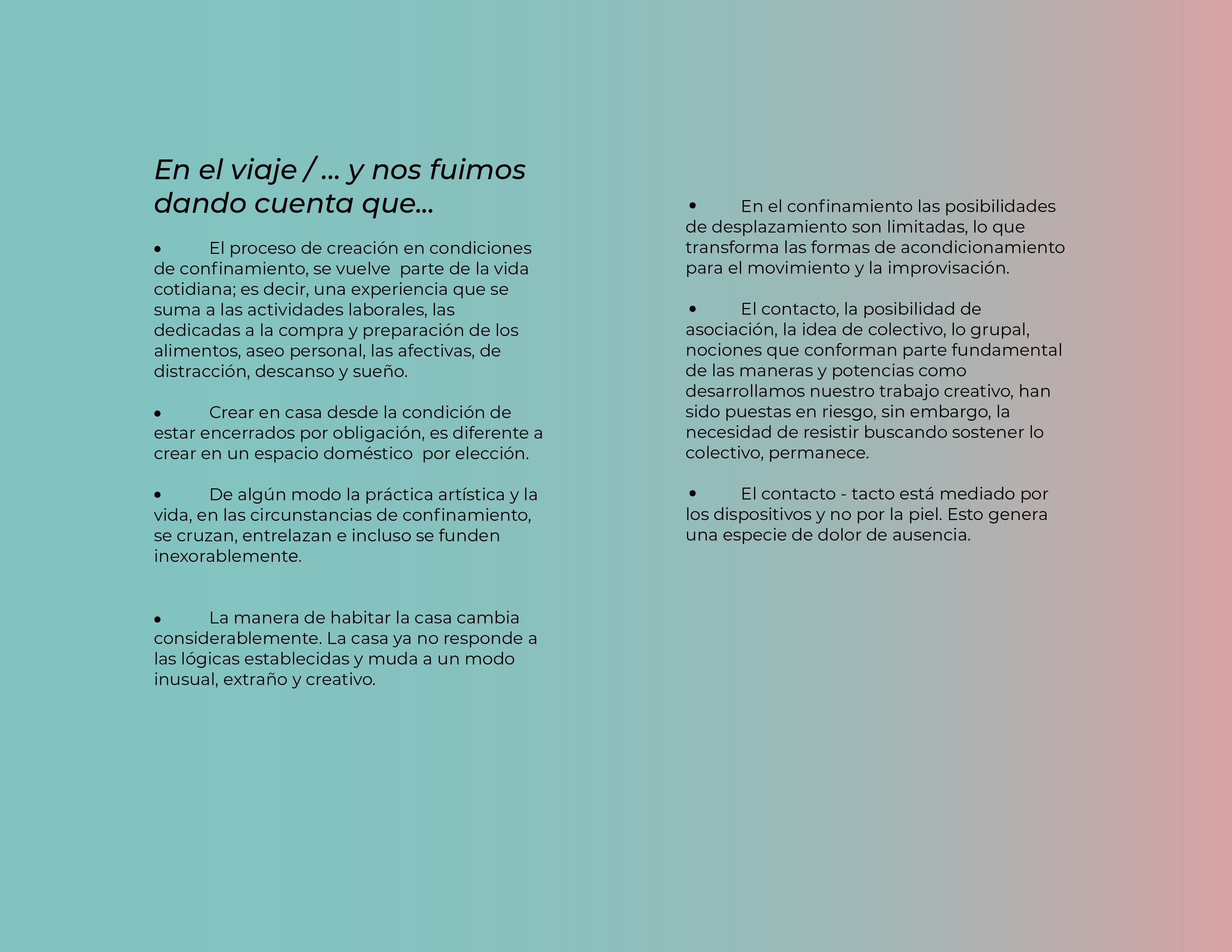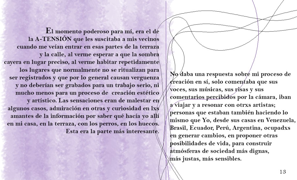 El Programa de creación en residencia Balao 2020 consistió en la realización de 5 residencias de creación con la participación de 7 artistas en 6 ciudades distintas durante alrededor de 21 días. Como parte de los procesos de creación/investigación propusimos a las artistas elaborar una reflexión manual, como un compendio de pistas, relatos y provocaciones acerca de la creación en casa.