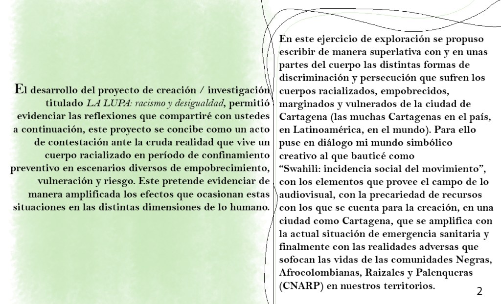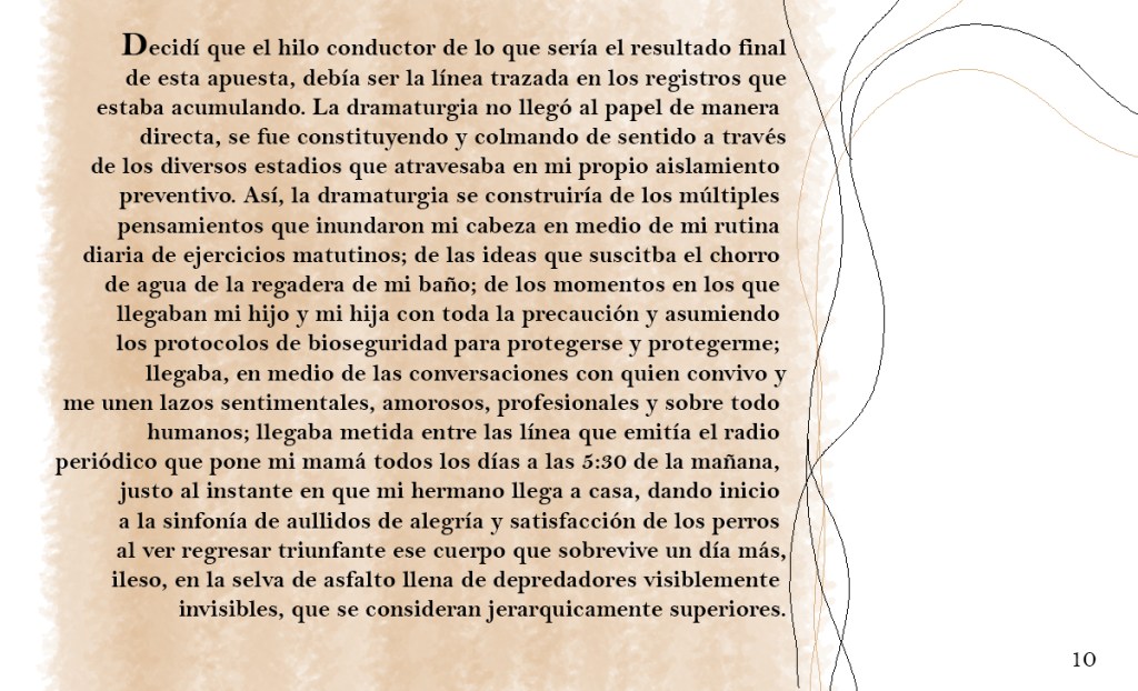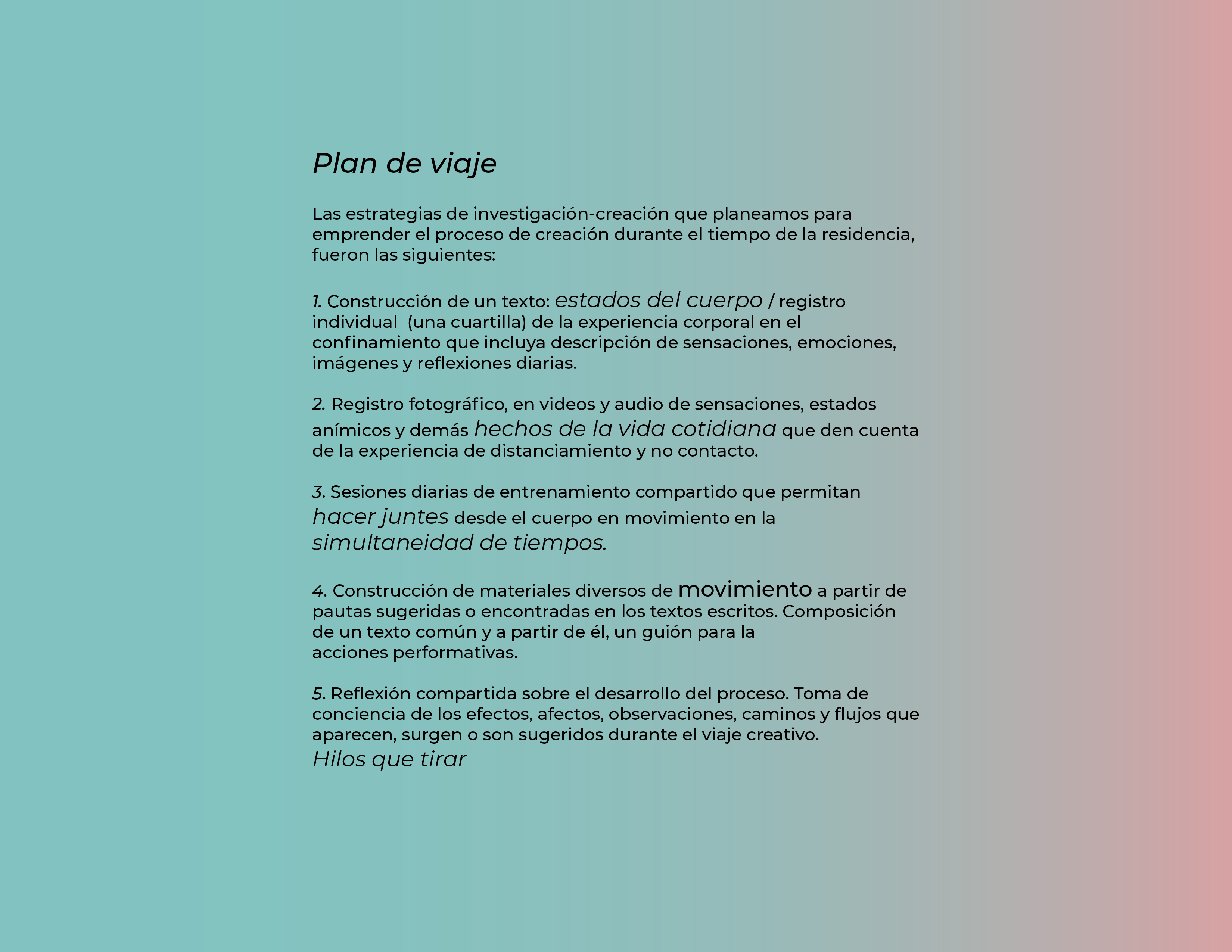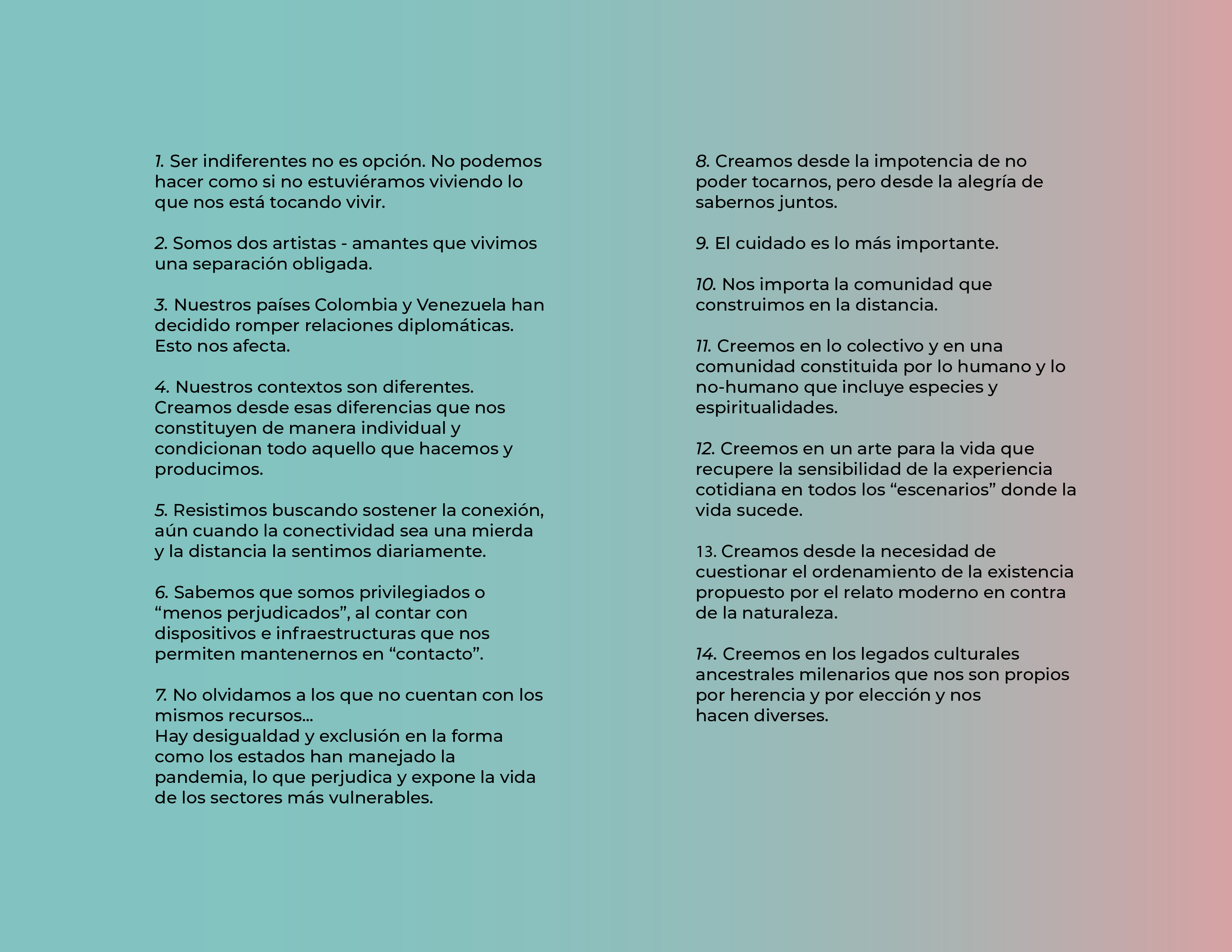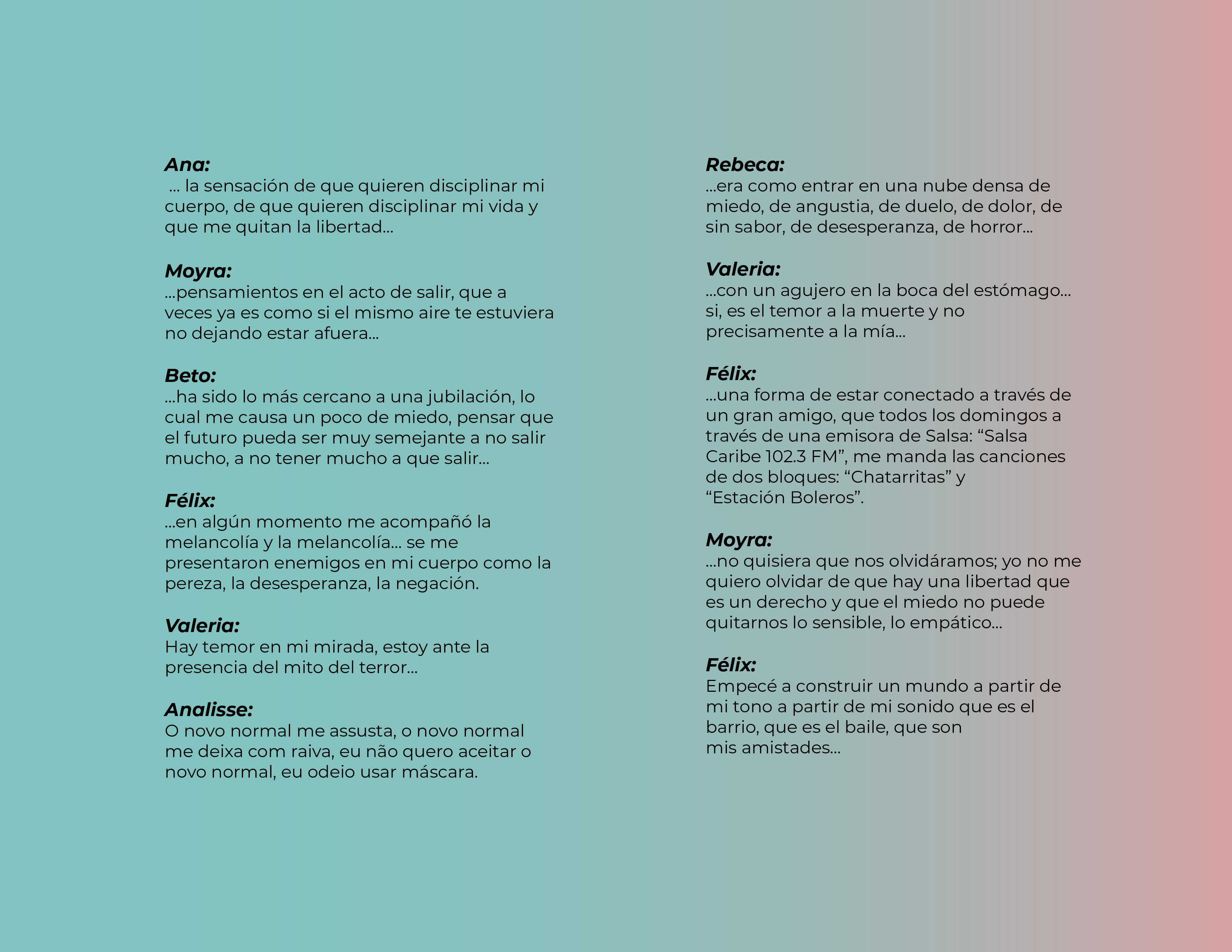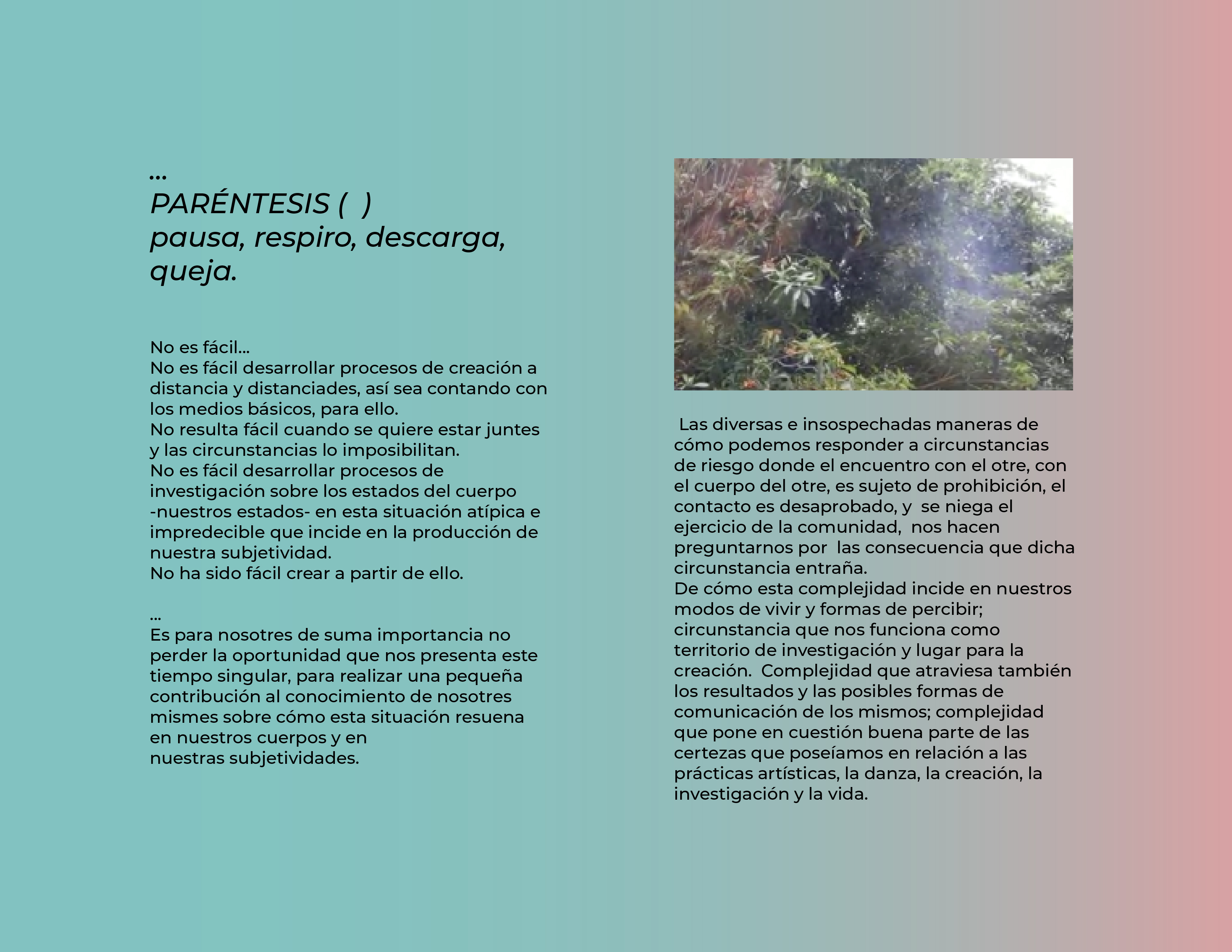 El Programa de creación en residencia Balao 2020 consistió en la realización de 5 residencias de creación con la participación de 7 artistas en 6 ciudades distintas durante alrededor de 21 días. Como parte de los procesos de creación/investigación propusimos a las artistas elaborar una reflexión manual, como un compendio de pistas, relatos y provocaciones acerca de la creación en casa.